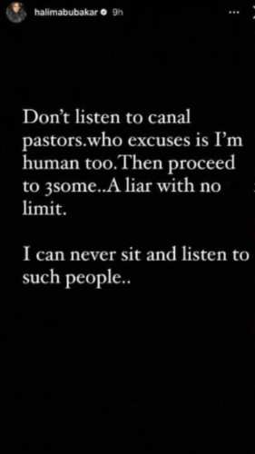 Actress Halima Abubakar issued a warning on her Instastory about deceptive pastors. She expressed her disdain for pastors who engage in immoral acts, such as threesomes, while using the excuse of being human.