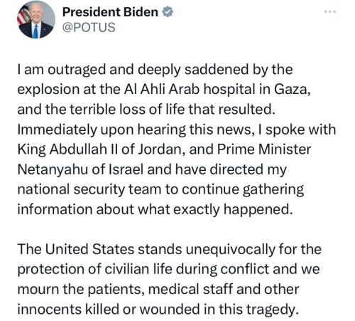 President Biden expressed his outrage and deep sorrow over the hospital explosion, stating, “I am outraged and deeply saddened by the explosion at the Al Ahli Arab hospital in Gaza, and the terrible loss of life that resulted.