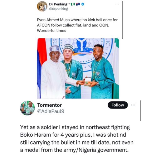 A Nigerian soldier, wounded in action while serving in the North East, has criticized President Tinubu’s decision to award houses, plots of land, and national honors to the Super Eagles players following their second-place finish in the recent AFCON tournament.